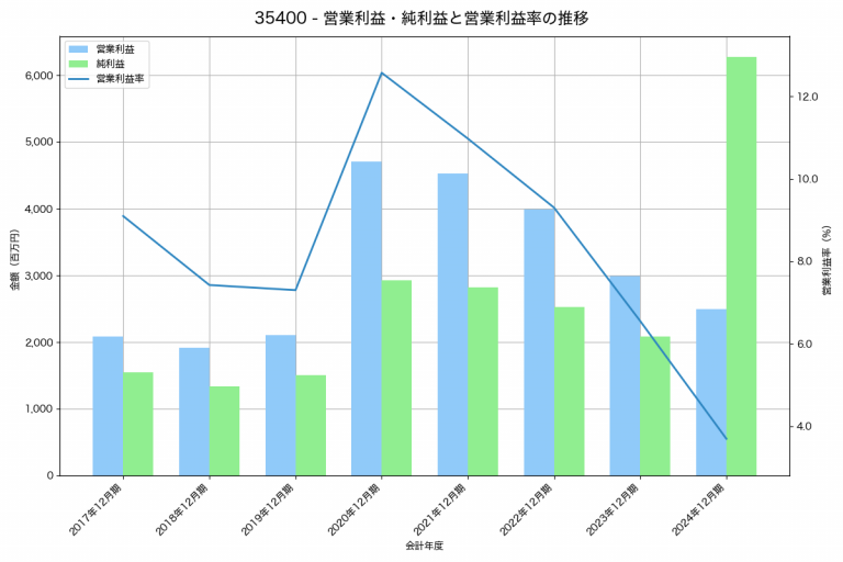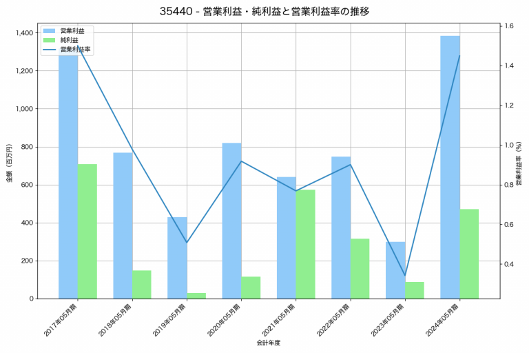 農業総合研究所の2024年08月期の営業利益は93百万円、営業利益率は1.3%と前年比57百万円増、営業利益率は0.7%pt増です。