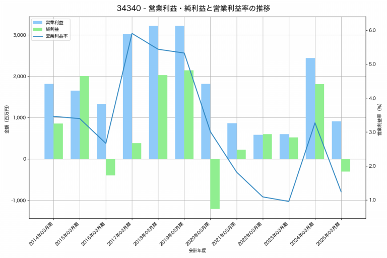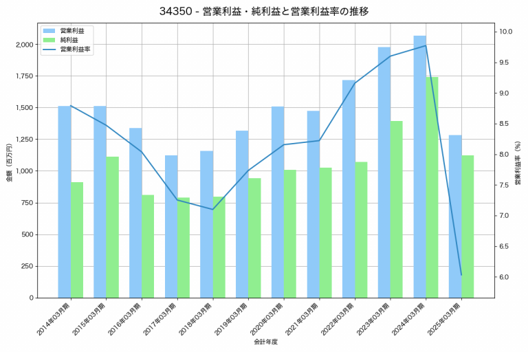 サンコーテクノの2025年03月期の営業利益は1,282百万円、営業利益率は6.0%と前年比784百万円減、営業利益率は3.7%pt減です。