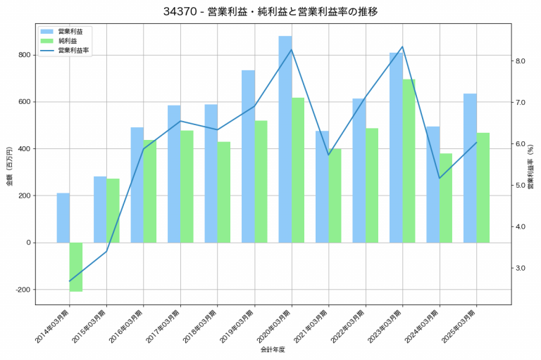 特殊電極の2025年03月期の営業利益は635百万円、営業利益率は6.0%と前年比140百万円増、営業利益率は0.9%pt増です。