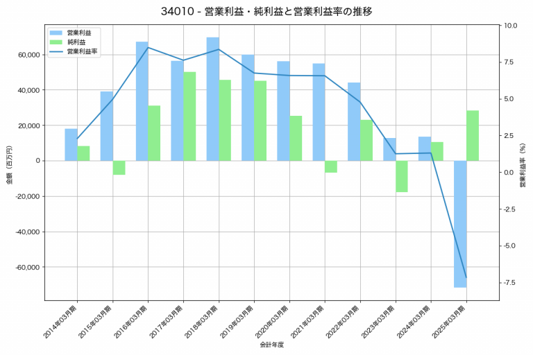 帝人の2025年03月期の営業利益は-71,828百万円、営業利益率は-7.1%と前年比85,370百万円減、営業利益率は8.5%pt減です。