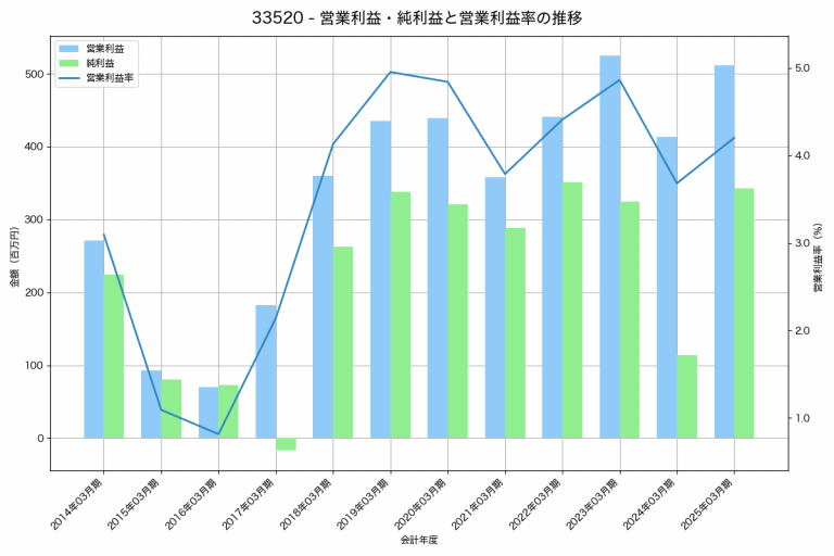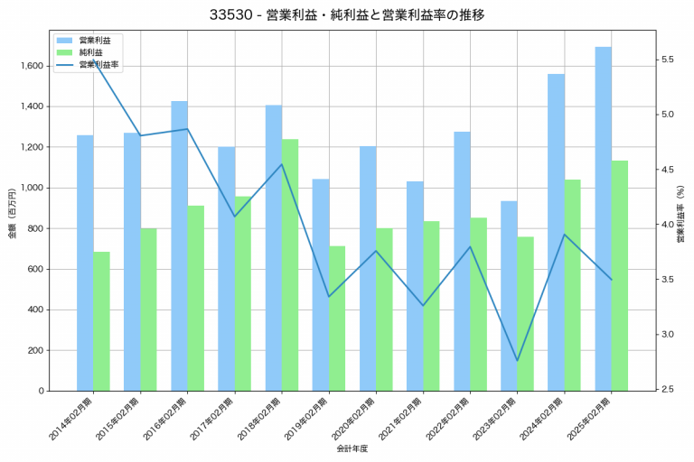 メディカル一光グループの2025年02月期の営業利益は1,692百万円、営業利益率は3.5%と前年比133百万円増、営業利益率は0.4%pt減です。