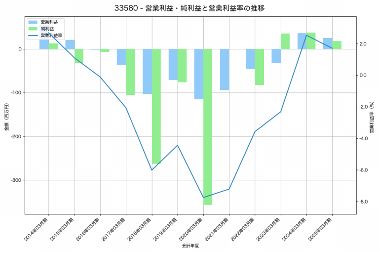ワイエスフードの2025年03月期の営業利益は25百万円、営業利益率は1.7%と前年比11百万円減、営業利益率は0.8%pt減です。