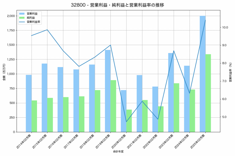 エストラストの2025年02月期の営業利益は1,998百万円、営業利益率は10.4%と前年比858百万円増、営業利益率は4.1%pt増です。