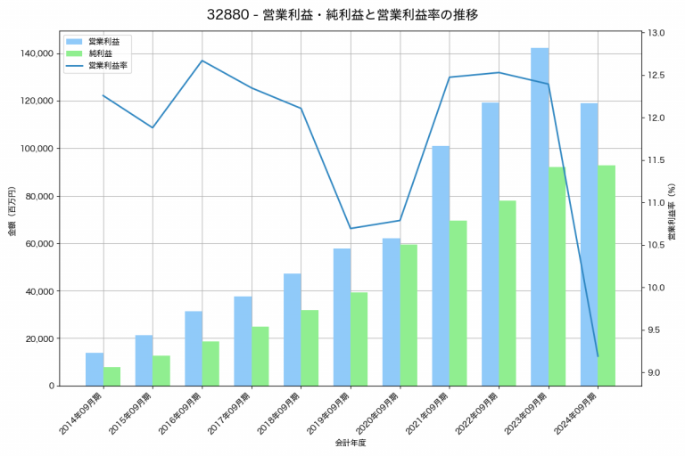 オープンハウスグループの2024年09月期の営業利益は119,088百万円、営業利益率は9.2%と前年比23,242百万円減、営業利益率は3.2%pt減です。
