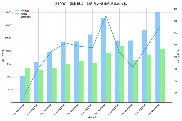 綿半ホールディングスの2025年03月期の営業利益は3,501百万円、営業利益率は2.6%と前年比679百万円増、営業利益率は0.4%pt増です。