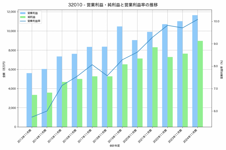 日本毛織の2024年11月期の営業利益は11,640百万円、営業利益率は10.1%と前年比624百万円増、営業利益率は0.4%pt増です。