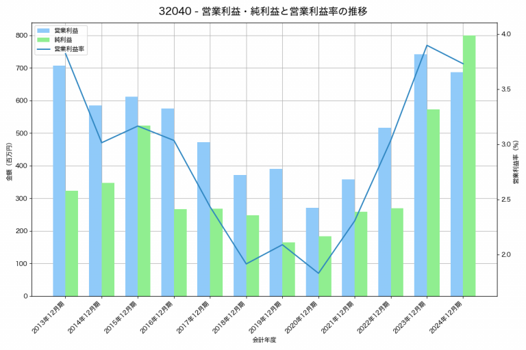 トーア紡コーポレーションの2024年12月期の営業利益は687百万円、営業利益率は3.7%と前年比55百万円減、営業利益率は0.2%pt減です。