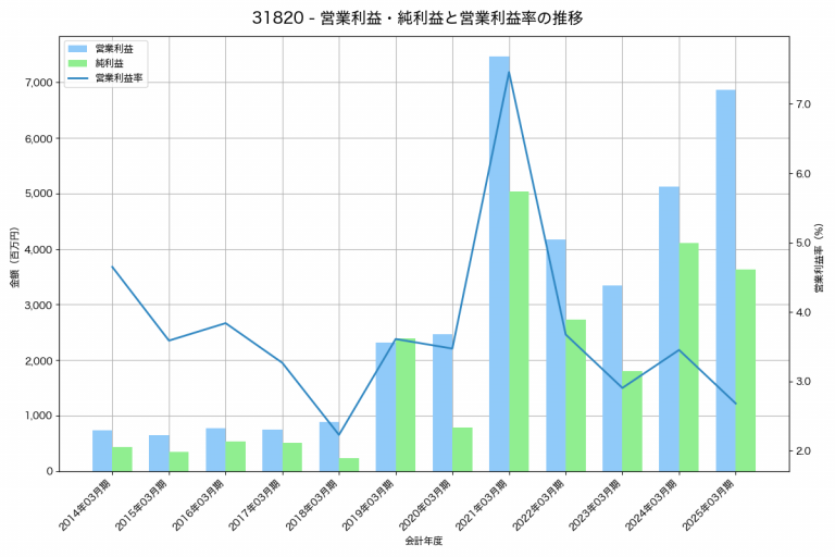 オイシックス・ラ・大地の2025年03月期の営業利益は6,864百万円、営業利益率は2.7%と前年比1,739百万円増、営業利益率は0.8%pt減です。