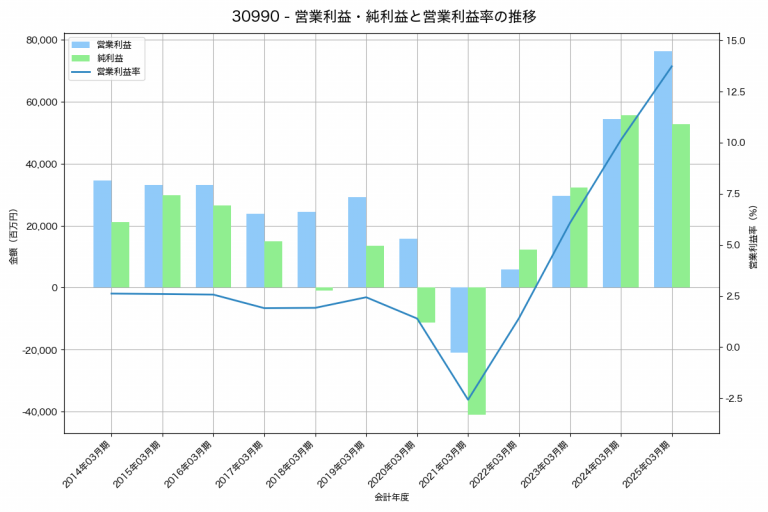 ユニチカの2025年03月期の営業利益は5,851百万円、営業利益率は4.6%と前年比8,326百万円増、営業利益率は6.7%pt増です。