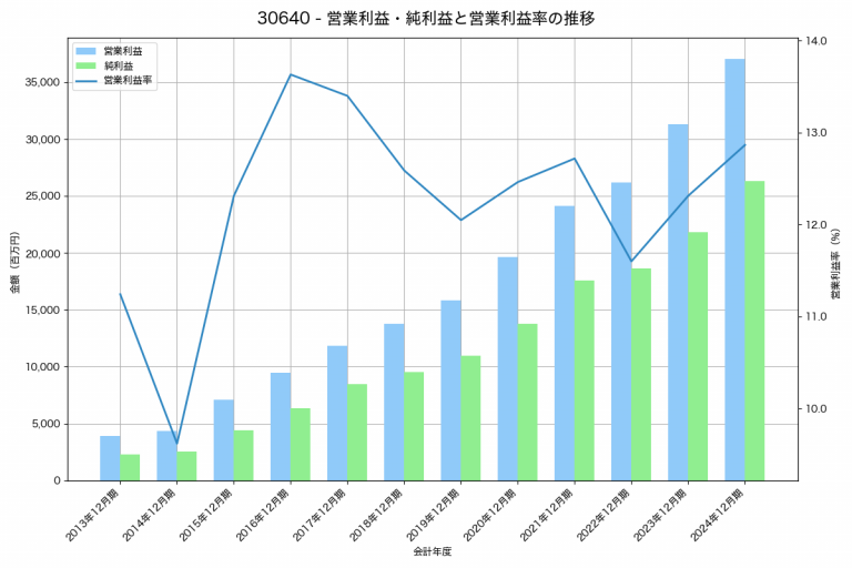 MonotaROの2024年12月期の営業利益は37,066百万円、営業利益率は12.9%と前年比5,757百万円増、営業利益率は0.6%pt増です。