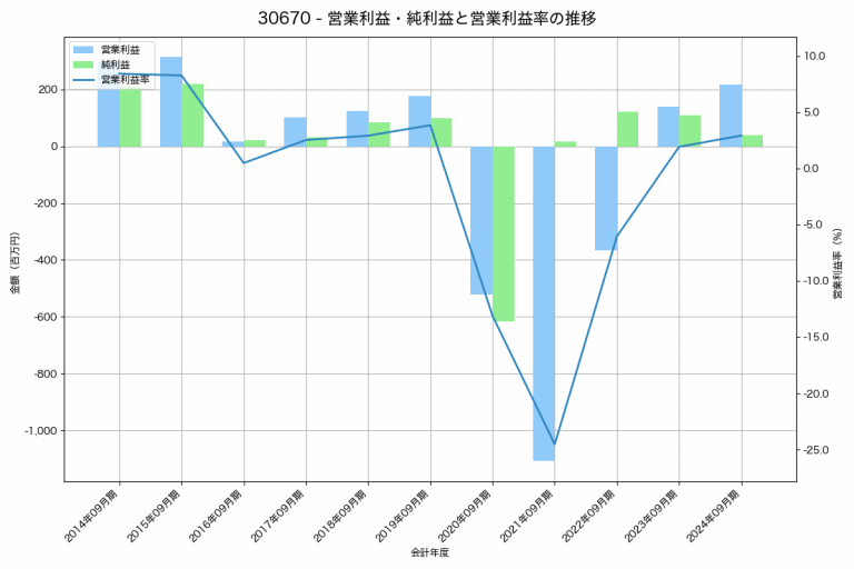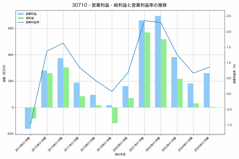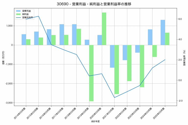 JFLAホールディングスの2025年03月期の営業利益は1,310百万円、営業利益率は2.0%と前年比496百万円増、営業利益率は0.8%pt増です。