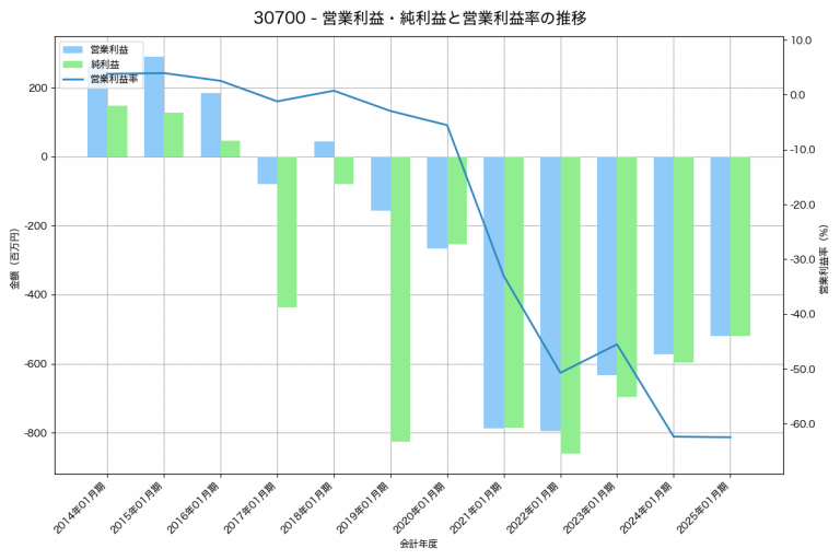 ジェリービーンズグループの2025年01月期の営業利益は-519百万円、営業利益率は-62.5%と前年比54百万円増、営業利益率は0.1%pt減です。