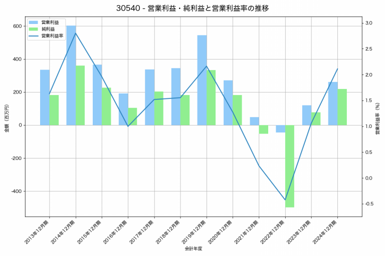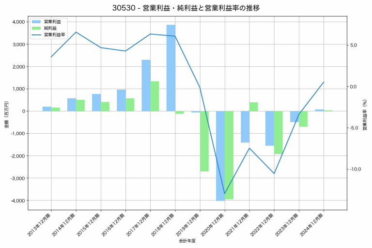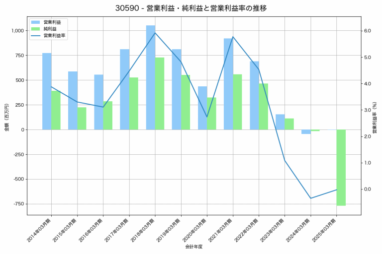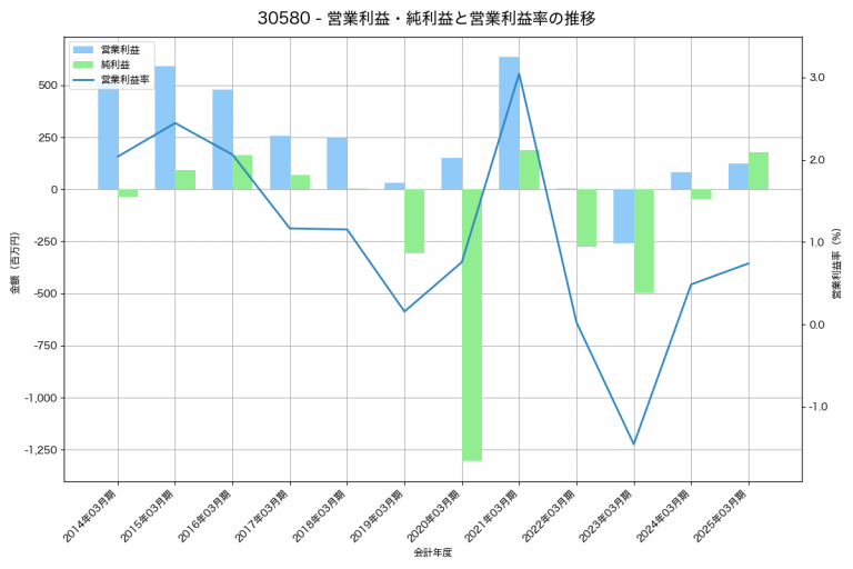 ヒラキの2025年03月期の営業利益は-3百万円、営業利益率は-0.0%と前年比43百万円増、営業利益率は0.3%pt増です。