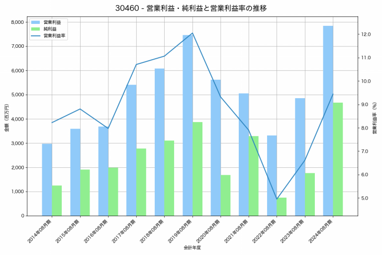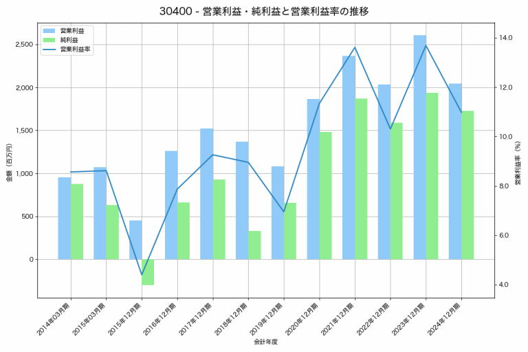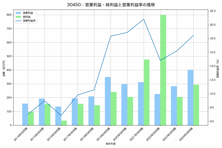 カワサキの2024年08月期の営業利益は402百万円、営業利益率は18.4%と前年比119百万円増、営業利益率は2.2%pt増です。