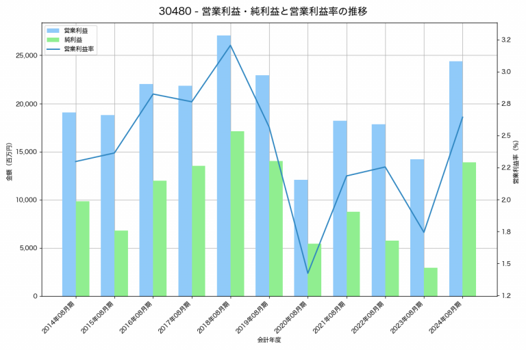 ビックカメラの2024年08月期の営業利益は24,388百万円、営業利益率は2.6%と前年比10,173百万円増、営業利益率は0.9%pt増です。