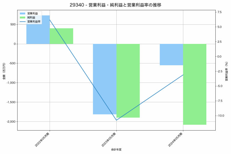 ジェイフロンティアの2024年05月期の営業利益は-553百万円、営業利益率は-3.1%と前年比1,263百万円増、営業利益率は7.7%pt増です。