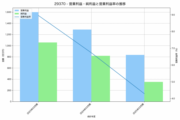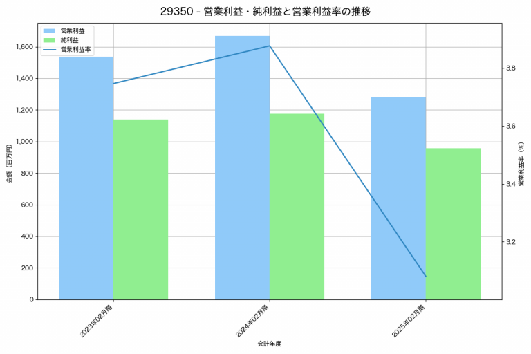 ピックルスホールディングスの2025年02月期の営業利益は1,279百万円、営業利益率は3.1%と前年比389百万円減、営業利益率は0.8%pt減です。