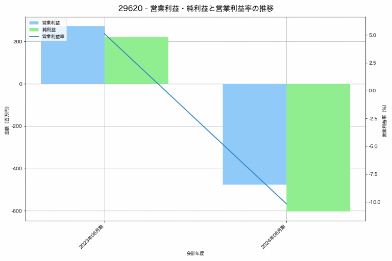 テクニスコの2024年06月期の営業利益は-476百万円、営業利益率は-10.2%と前年比749百万円減、営業利益率は15.3%pt減です。