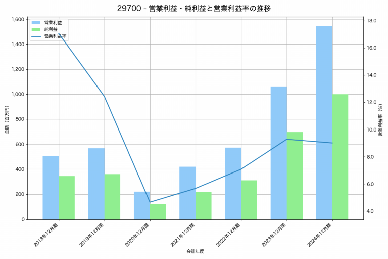 サンクゼールの2025年03月期の営業利益は835百万円、営業利益率は4.3%と前年比454百万円減、営業利益率は2.4%pt減です。