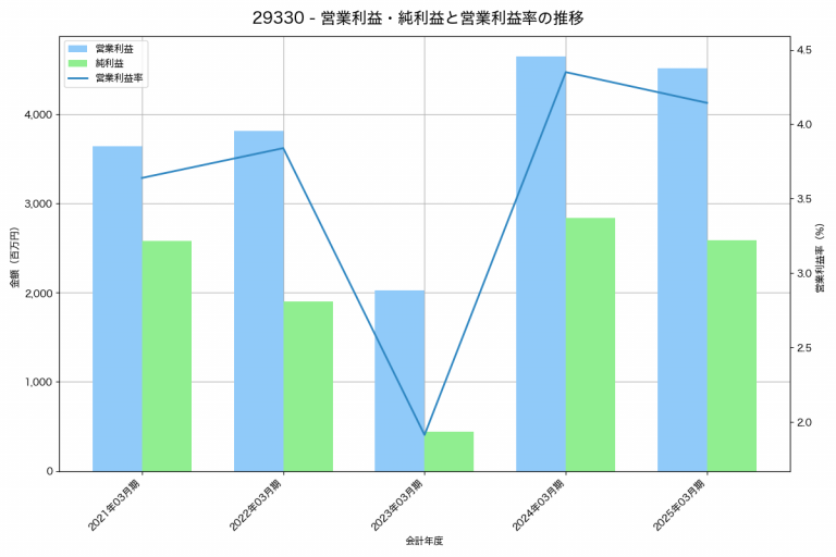 紀文食品の2025年03月期の営業利益は4,513百万円、営業利益率は4.1%と前年比128百万円減、営業利益率は0.2%pt減です。