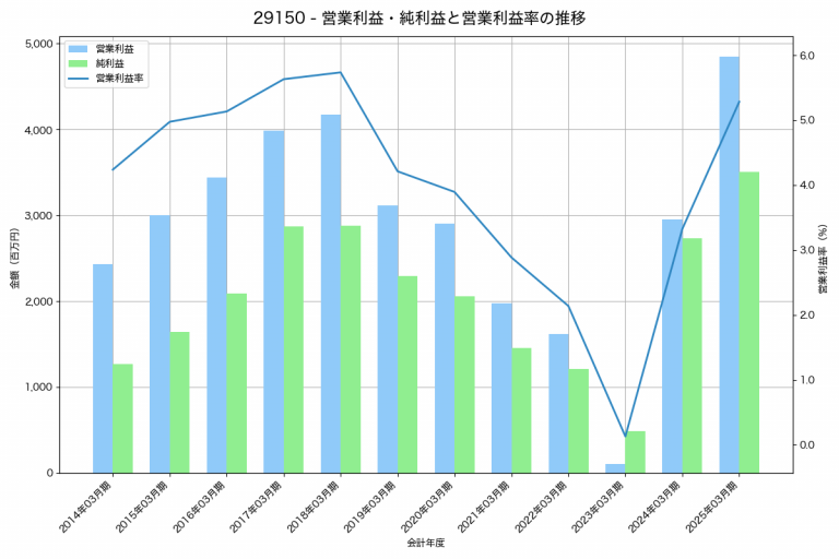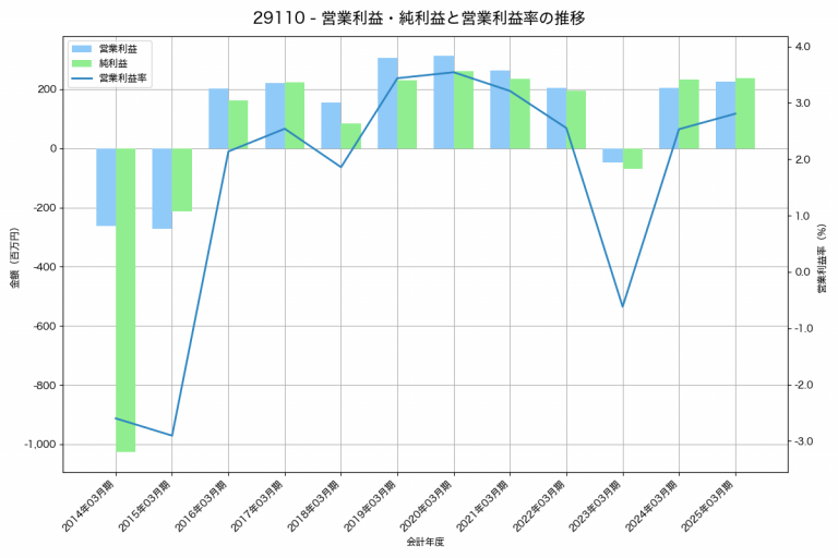 旭松食品の2025年03月期の営業利益は225百万円、営業利益率は2.8%と前年比20百万円増、営業利益率は0.3%pt増です。