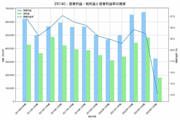 日本たばこ産業の2024年12月期の営業利益は323,461百万円、営業利益率は10.3%と前年比348,949百万円減、営業利益率は13.4%pt減です。